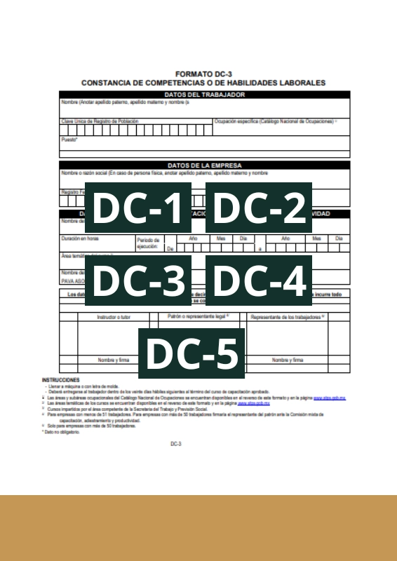 El DC1, DC2, DC3, DC4 y DC5 son formatos establecidos por la Secretaría del Trabajo y Previsión Social (STPS) en México, se encuentran definidos dentro del marco del Acuerdo de Capacitación 2013 publicado en el Diario Oficial de la Federación.
